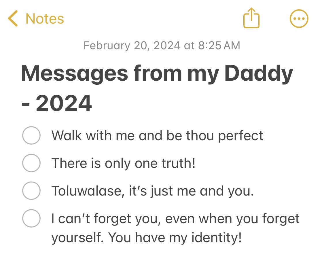 In 2023, I started doing this thing called ‘Messages from my Daddy’. I would write down things God told me – sometimes in prayer, sometimes in worship, when I was in the shower, eating, in church, whenever. I would hear these words at different times, and I started to document them. It was through this that I discovered the mistake I had been making. My sense of purpose was so warped, that I thought what I did for a living was my identity, and If I didn’t have that figured out, then I was incomplete.
